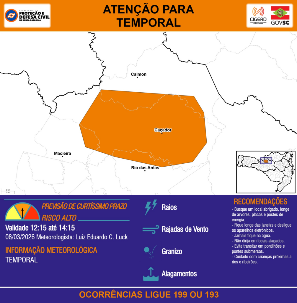 ATENÇÃO – 08/03 12:15 – TEMPORAL com RAIOS, RAJADAS DE VENTO, GRANIZO e ALAGAMENTOS para os municípios de Calmon, Caçador, Macieira, Rio das Antas e Videira nas próximas 2 horas. Ocorrências ligue 199 ou 193.