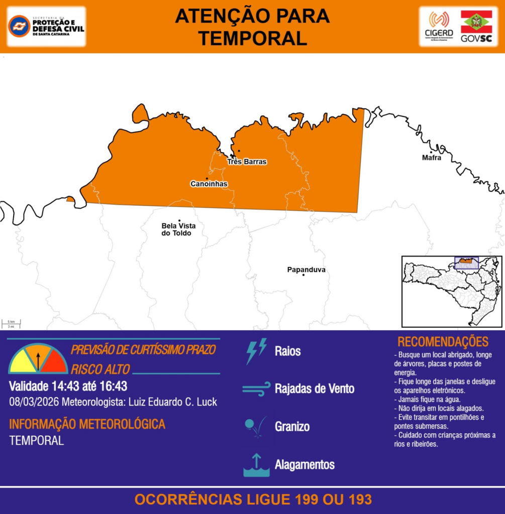 ATENÇÃO – 08/03 14:43 – TEMPORAL com RAIOS, RAJADAS DE VENTO, GRANIZO e ALAGAMENTOS para os municípios de Bela Vista do Toldo, Canoinhas, Mafra, Papanduva e Três Barras nas próximas 2 horas. Ocorrências ligue 199 ou 193.