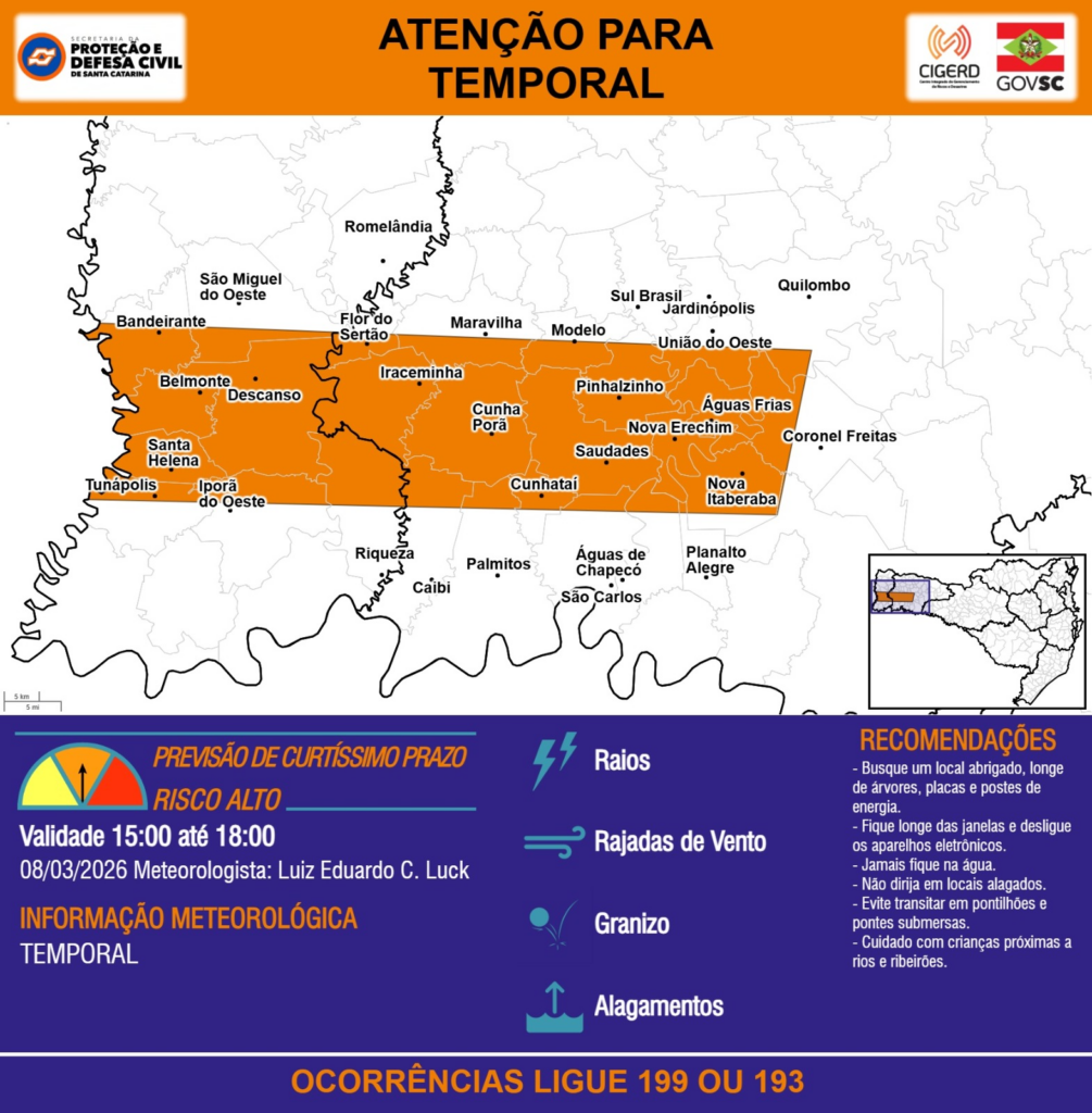 ATENÇÃO – 08/03 15:00 – TEMPORAL com RAIOS, RAJADAS DE VENTO, GRANIZO e ALAGAMENTOS para as regiões do Extremo Oeste e Oeste nas próximas 3 horas. Ocorrências ligue 199 ou 193.