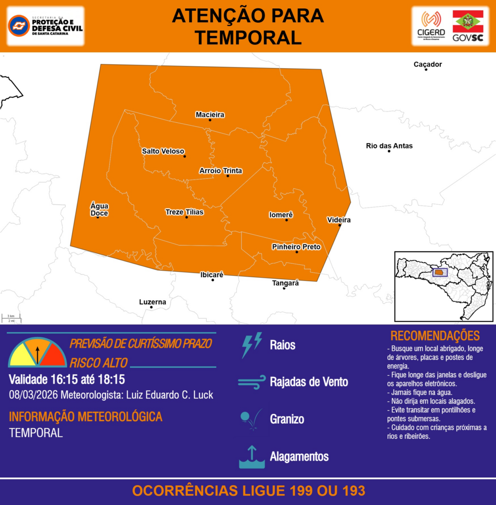 ATENÇÃO – 08/03 16:15 – TEMPORAL com RAIOS, RAJADAS DE VENTO, GRANIZO e ALAGAMENTOS para os municípios de Arroio Trinta, Caçador, Ibicaré, Iomerê, Luzerna, Macieira, Pinheiro Preto, Rio das Antas, Salto Veloso, Tangará, Treze Tílias, Videira e Água Doce nas próximas 2 horas. Ocorrências ligue 199 ou 193.