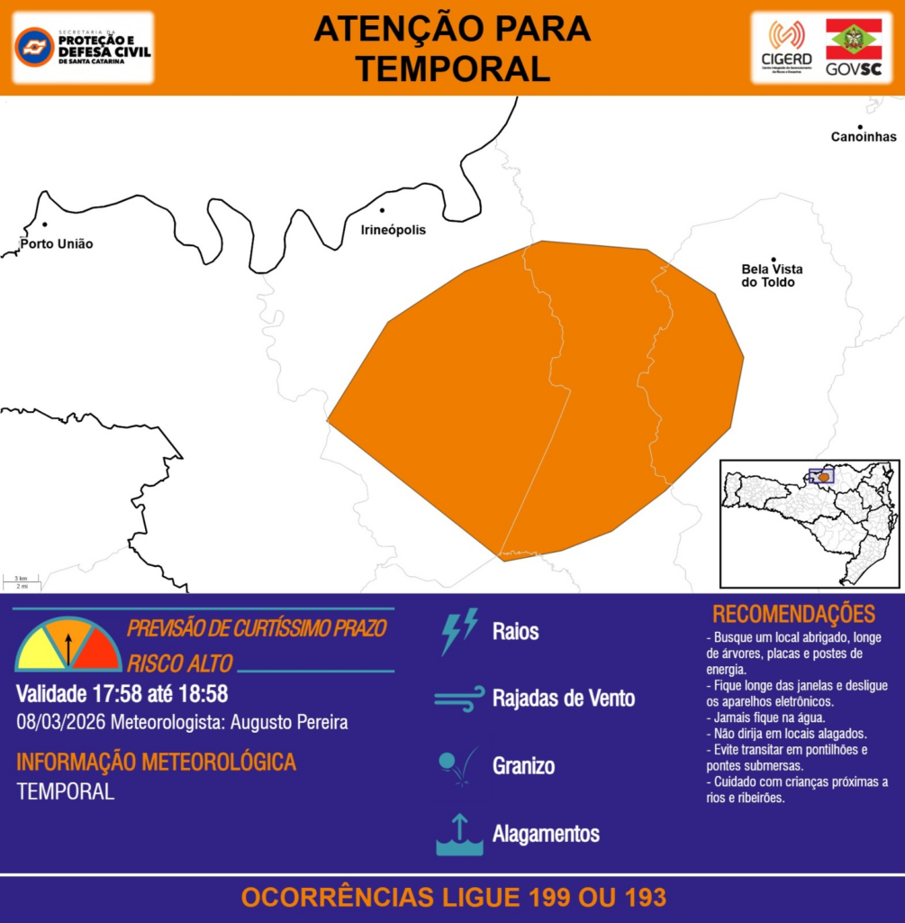 ATENÇÃO – 08/03 17:58 – TEMPORAL com RAIOS, RAJADAS DE VENTO, GRANIZO e ALAGAMENTOS para os municípios de Bela Vista do Toldo, Canoinhas, Irineópolis e Porto União na próxima hora. Ocorrências ligue 199 ou 193.