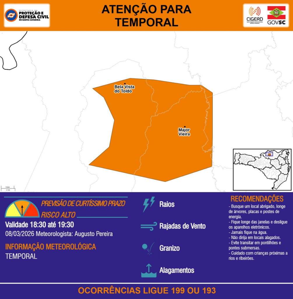 ATENÇÃO – 08/03 18:30 – TEMPORAL com RAIOS, RAJADAS DE VENTO, GRANIZO e ALAGAMENTOS para os municípios de Bela Vista do Toldo e Major Vieira na próxima hora. Ocorrências ligue 199 ou 193.