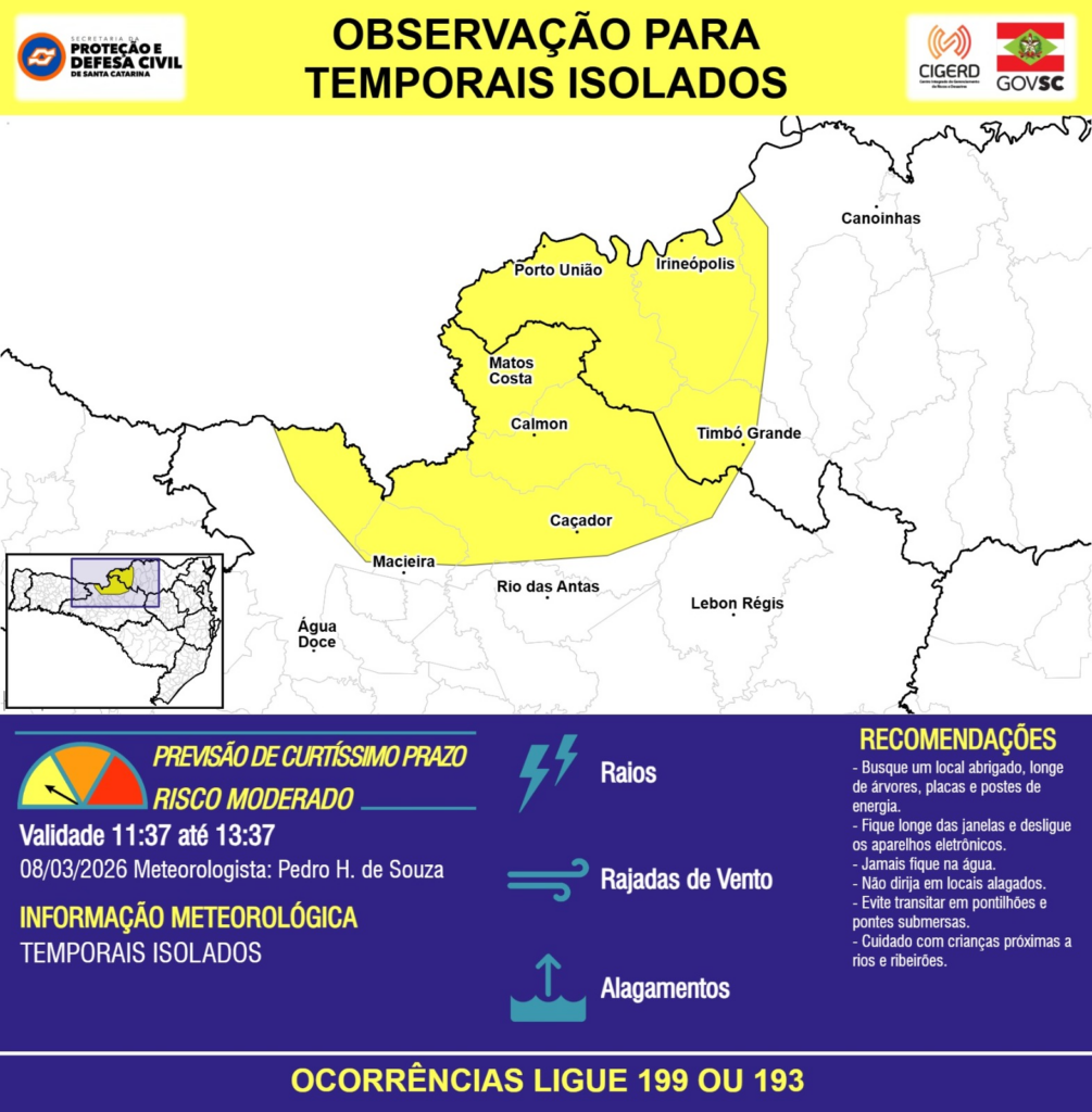 OBSERVAÇÃO – 08/03 11:37 – TEMPORAIS ISOLADOS com RAIOS, RAJADAS DE VENTO e ALAGAMENTOS pontuais para áreas dos municípios de Calmon, Canoinhas, Caçador, Irineópolis, Lebon Régis, Macieira, Matos Costa, Porto União, Rio das Antas, Timbó Grande e Água Doce nas próximas 2 horas. Ocorrências ligue 199 ou 193.