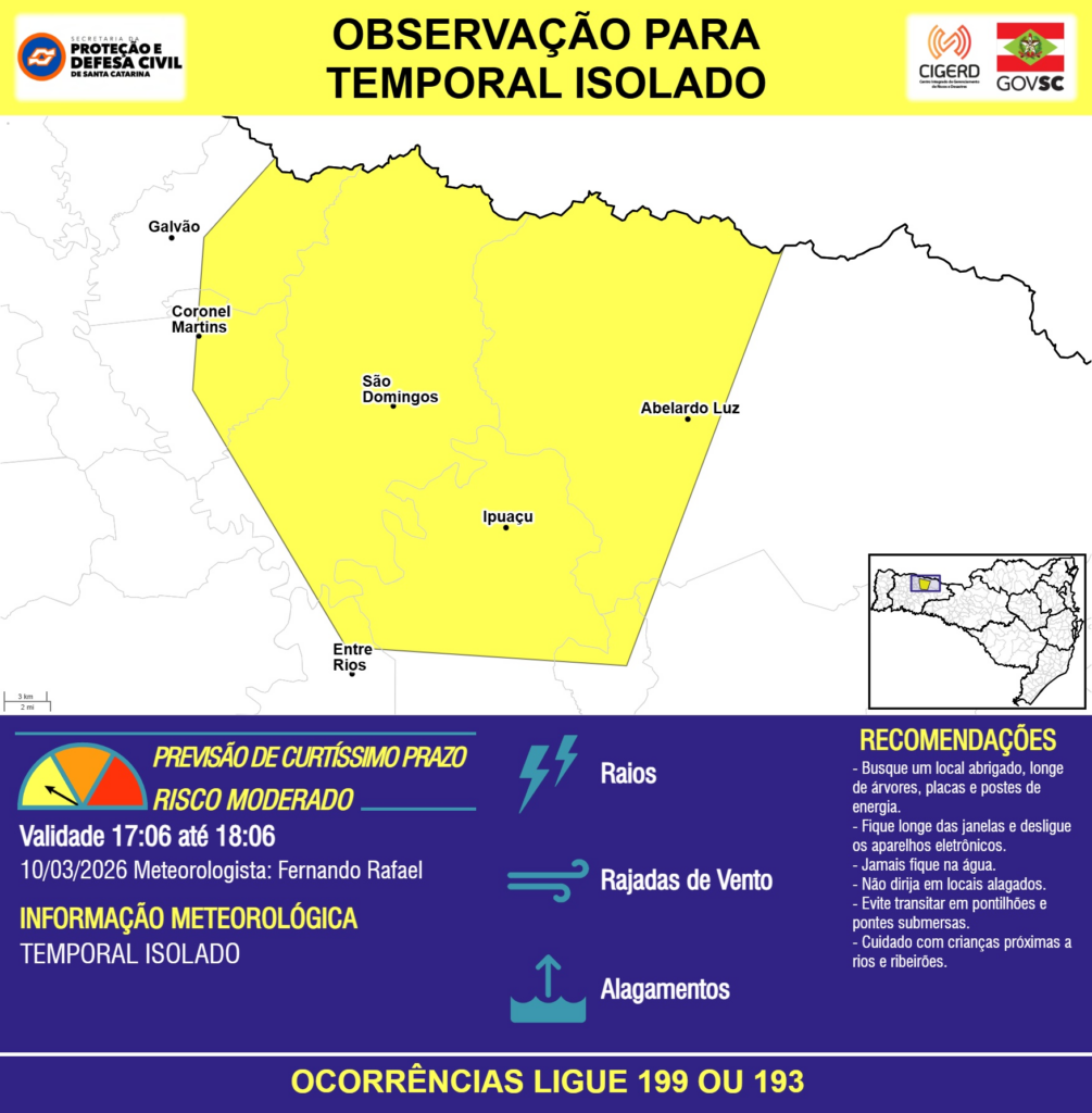 OBSERVAÇÃO – 10/03 17:06 – TEMPORAL ISOLADO com RAIOS, RAJADAS DE VENTO e ALAGAMENTOS pontuais para os municípios de Abelardo Luz, Coronel Martins, Entre Rios, Galvão, Ipuaçu e São Domingos na próxima hora. Ocorrências ligue 199 ou 193.