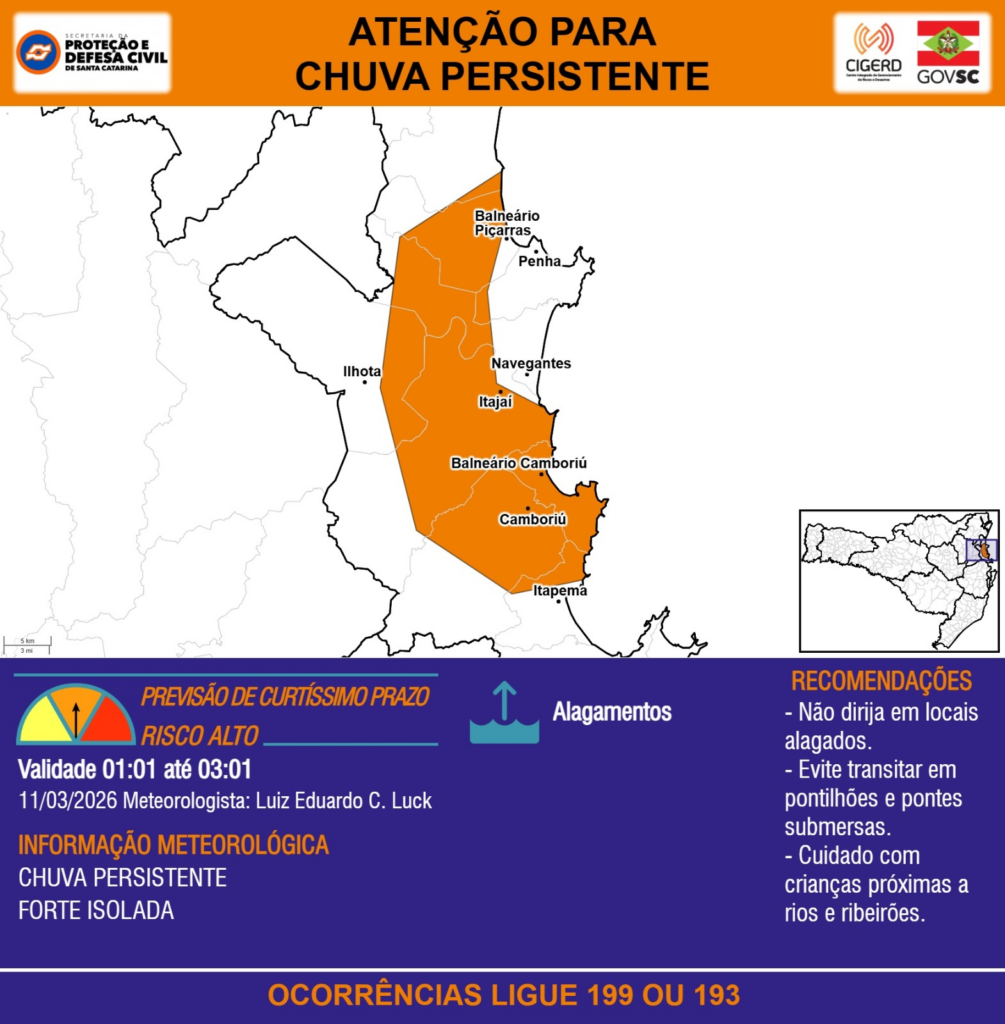 ATENÇÃO – 11/03 01:01 – CHUVA PERSISTENTE de intensidade forte isolada com ALAGAMENTOS para os municípios de Balneário Camboriú, Balneário Piçarras, Camboriú, Ilhota, Itajaí, Itapema, Navegantes e Penha nas próximas 2 horas. Ocorrências ligue 199 ou 193.