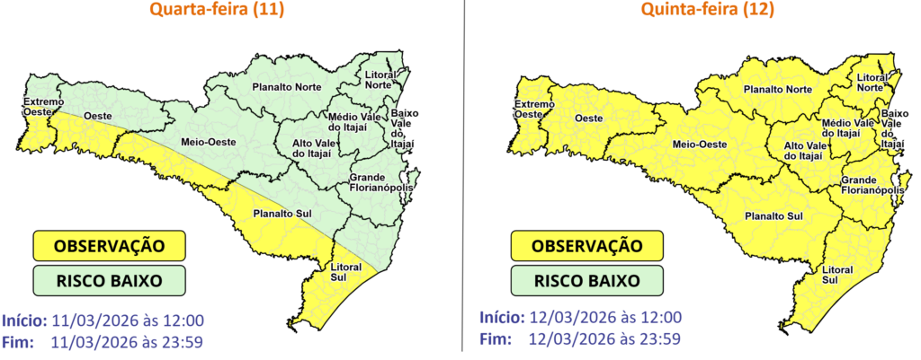 Na tarde e noite da quarta (11), os temporais isolados com chuva intensa se concentram principalmente nas regiões de divisa com o RS (Grande Oeste, Planalto Sul e Litoral Sul), onde o risco é MODERADO para ocorrências como alagamentos, destelhamentos, queda de galhos e árvores e danos na rede elétrica. Nas demais regiões, o risco é baixo.
