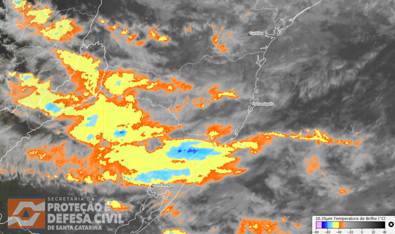 A tarde desta quarta-feira (11) foi marcada por muitas nuvens pelo estado e por chuva passageira em trechos do Planalto Sul e Litoral Sul, mais próximos à divisa com o RS. As temperaturas variam entre 22°C e 28°C no Oeste, 20°C a 25°C no Litoral e entre 18°C e 23°C no Médio e Alto Vale do Itajaí. Os ventos variam de direção norte/nordeste, apresentando fraca intensidade. Nas próximas horas, permanece a condição para pancadas de chuva e temporais muito isolados nas áreas próximas ao RS, especialmente entre o Meio-Oeste, Planalto Sul e Litoral Sul com risco baixo a pontualmente moderado para ocorrências associadas à alagamentos pontuais e destelhamentos. Entre a Grd. Florianópolis, Vale do Itajaí e Litoral Norte, há condições para chuvas rápidas, em função da circulação marítima, mas sem risco para ocorrências associadas.