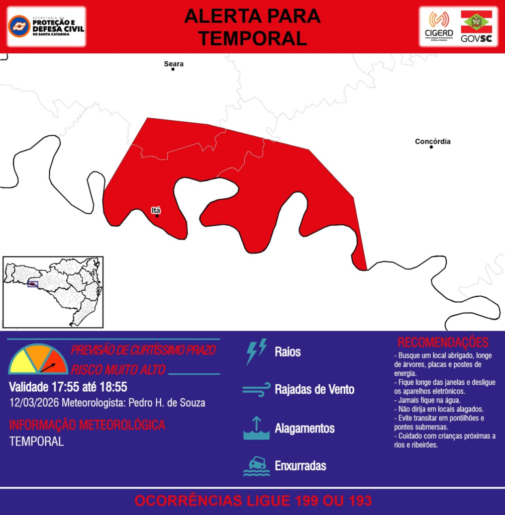 ALERTA – 12/03 17:55 – TEMPORAL com RAIOS, RAJADAS DE VENTO, ALAGAMENTOS e risco de ENXURRADAS para os municípios de Concórdia, Itá e Seara na próxima hora. Ocorrências ligue 199 ou 193.