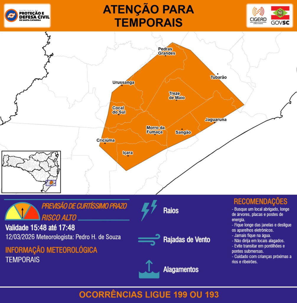 ATENÇÃO – 12/03 15:48 – TEMPORAIS com RAIOS, RAJADAS DE VENTO e ALAGAMENTOS para os municípios de Cocal do Sul, Criciúma, Içara, Jaguaruna, Morro da Fumaça, Pedras Grandes, Sangão, Treze de Maio, Tubarão e Urussanga nas próximas 2 horas. Ocorrências ligue 199 ou 193.