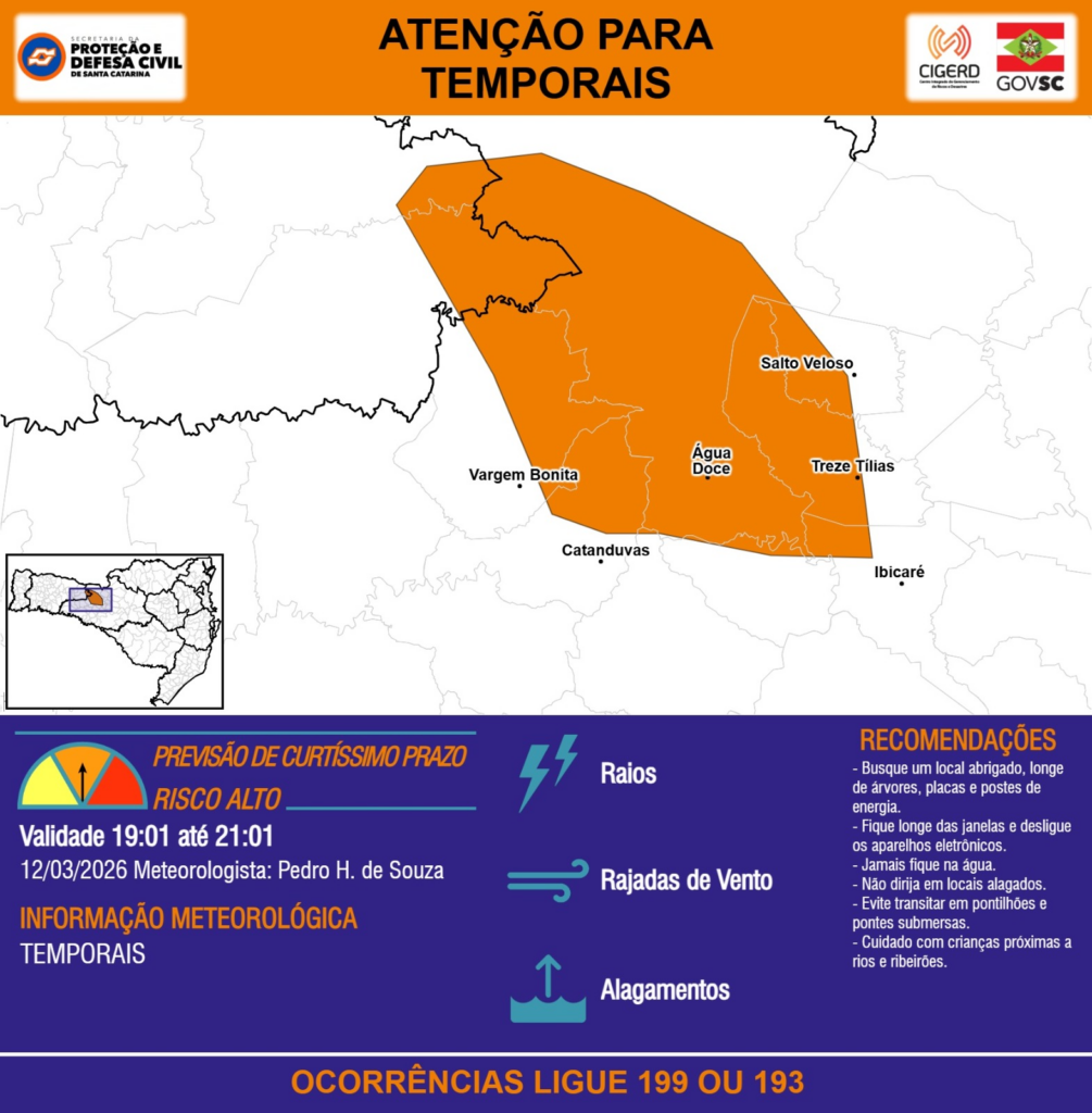 ATENÇÃO – 12/03 18:50 – TEMPORAIS com RAIOS, RAJADAS DE VENTO e ALAGAMENTOS para áreas dos municípios de Abelardo Luz, Bom Jesus, Faxinal dos Guedes, Ipuaçu, Lajeado Grande, Lindóia do Sul, Ouro Verde, Passos Maia, Ponte Serrada, Vargem Bonita, Vargeão, Xanxerê, Xavantina e Xaxim nas próximas 2 horas. Ocorrências ligue 199 ou 193.