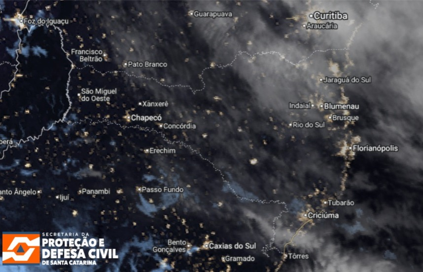 A quinta-feira (12) vai começando com cobertura de nuvens em quase todas as regiões. Ainda pela manhã há condições para a formação de chuva leve na metade leste de Santa Catarina, especialmente no Litoral Norte, Grande Florianópolis e Baixo Vale do Itajaí. Nas demais áreas, o tempo segue firme até o início da tarde, quando são esperados temporais isolados, iniciando pelas áreas próximas à divisa com o RS e avançando para as demais regiões ao longo da tarde e noite. O risco é moderado para ocorrências associadas aos temporais. No momento, as temperaturas variam de 12°C a 23°C em todo o estado, sendo as mais baixas registradas no Planalto Sul e as mais altas no Litoral e Oeste. O vento sopra fraco e sem direção predominante em todas as regiões.