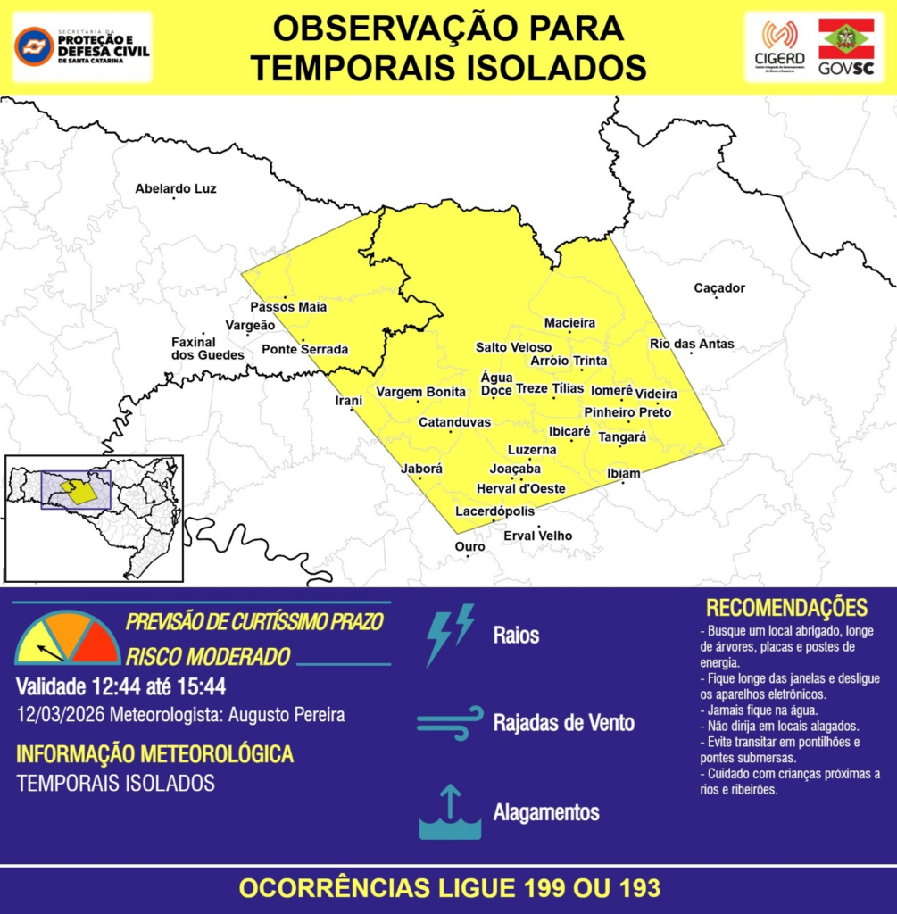 OBSERVAÇÃO – 12/03 12:44 – TEMPORAIS ISOLADOS com RAIOS, RAJADAS DE VENTO e ALAGAMENTOS pontuais para os municípios de Abelardo Luz, Arroio Trinta, Catanduvas, Caçador, Erval Velho, Faxinal dos Guedes, Herval d’Oeste, Ibiam, Ibicaré, Iomerê, Irani, Jaborá, Joaçaba, Lacerdópolis, Luzerna, Macieira, Ouro, Passos Maia, Pinheiro Preto, Ponte Serrada, Rio das Antas, Salto Veloso, Tangará, Treze Tílias, Vargem Bonita, Vargeão, Videira e Água Doce nas próximas 3 horas. Ocorrências ligue 199 ou 193.
