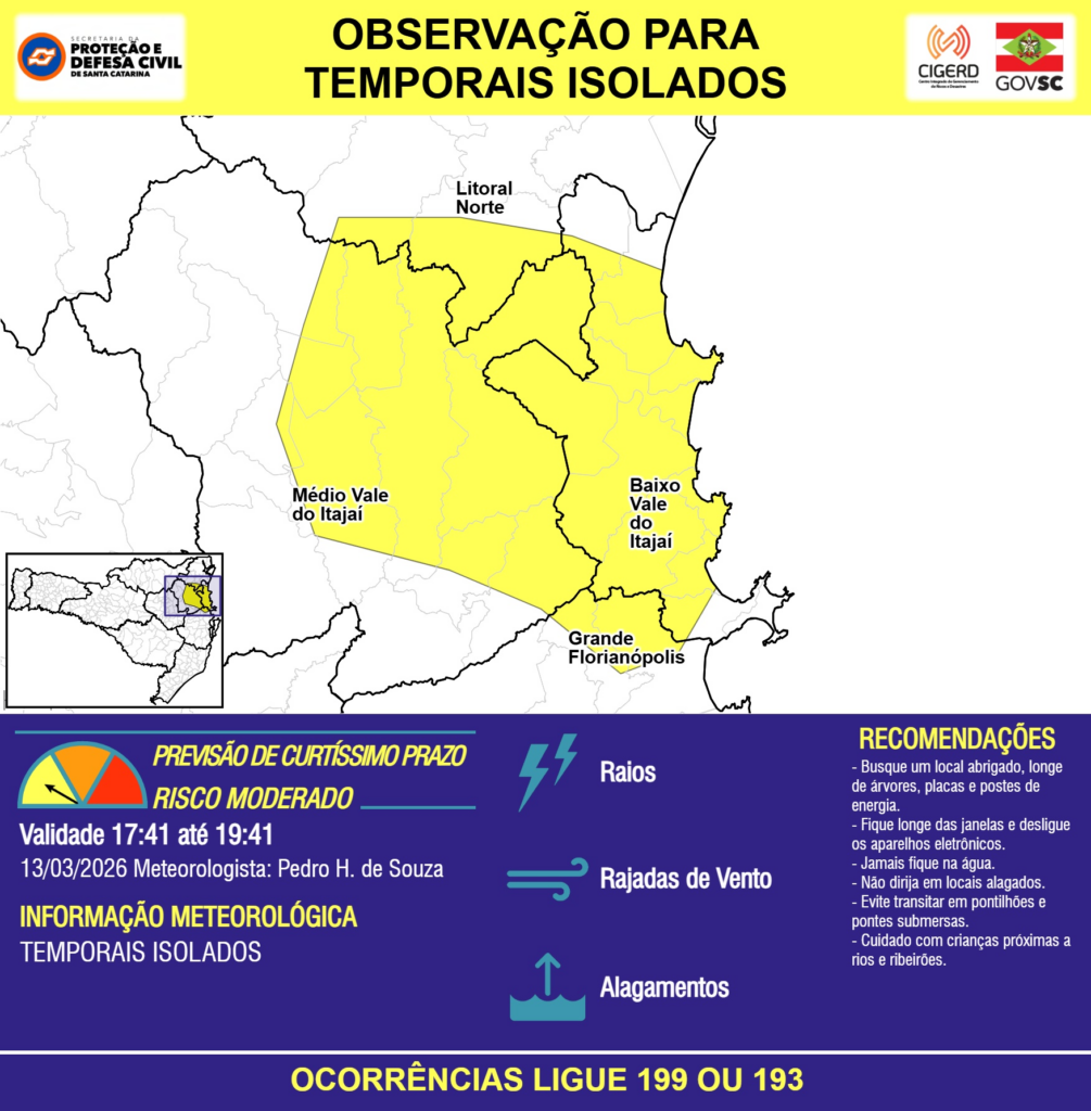 OBSERVAÇÃO – 13/03 17:41 – TEMPORAIS ISOLADOS com RAIOS, RAJADAS DE VENTO e ALAGAMENTOS pontuais para áreas das regiões do Litoral Norte, Grande Florianópolis, Baixo e Médio Vale do Itajaí nas próximas 2 horas. Ocorrências ligue 199 ou 193.