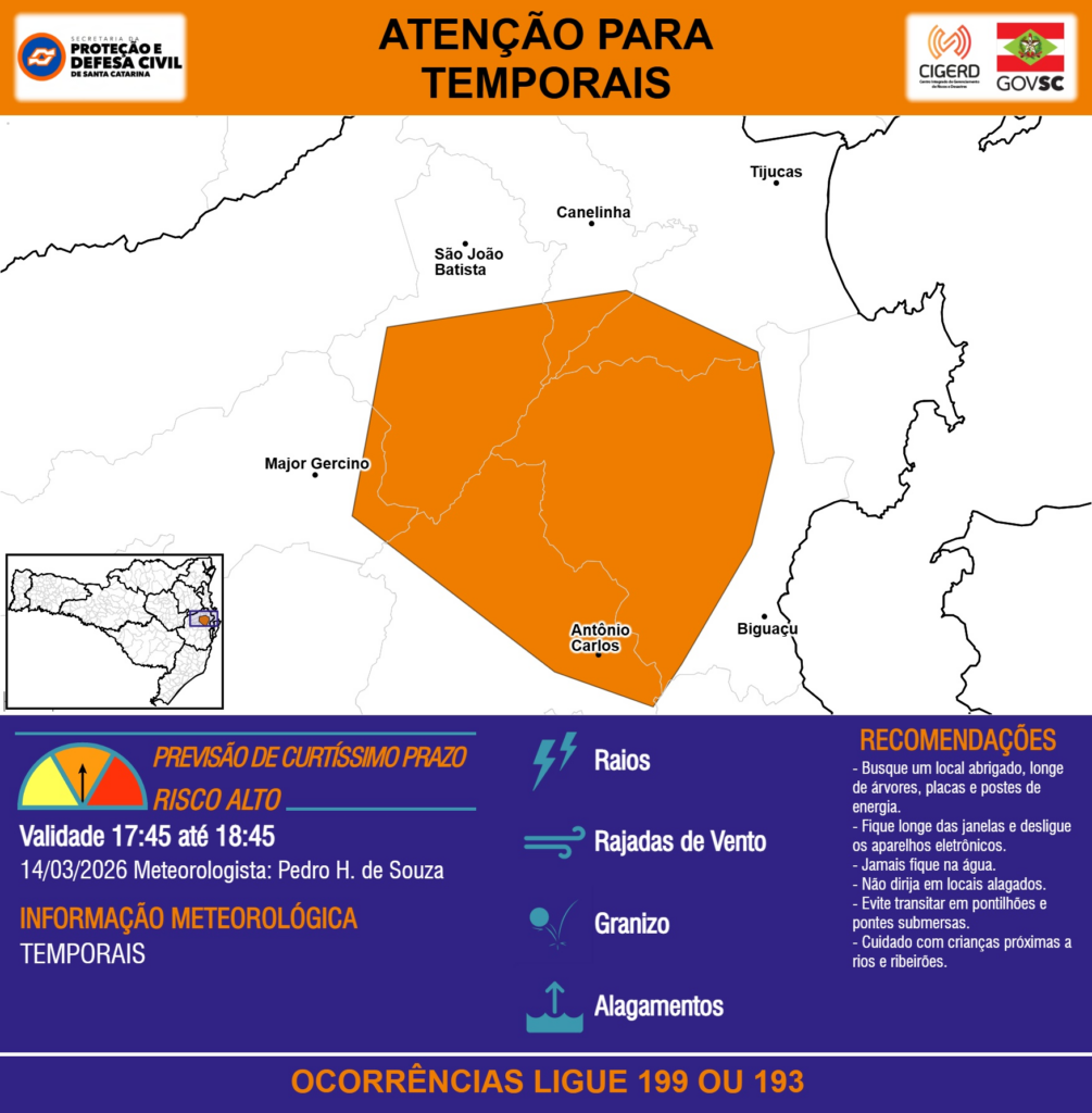 ATENÇÃO – 14/03 17:45 – TEMPORAIS com RAIOS, RAJADAS DE VENTO, GRANIZO e ALAGAMENTOS para áreas dos municípios de Antônio Carlos, Biguaçu, Canelinha, Major Gercino, São João Batista e Tijucas na próxima hora. Ocorrências ligue 199 ou 193.