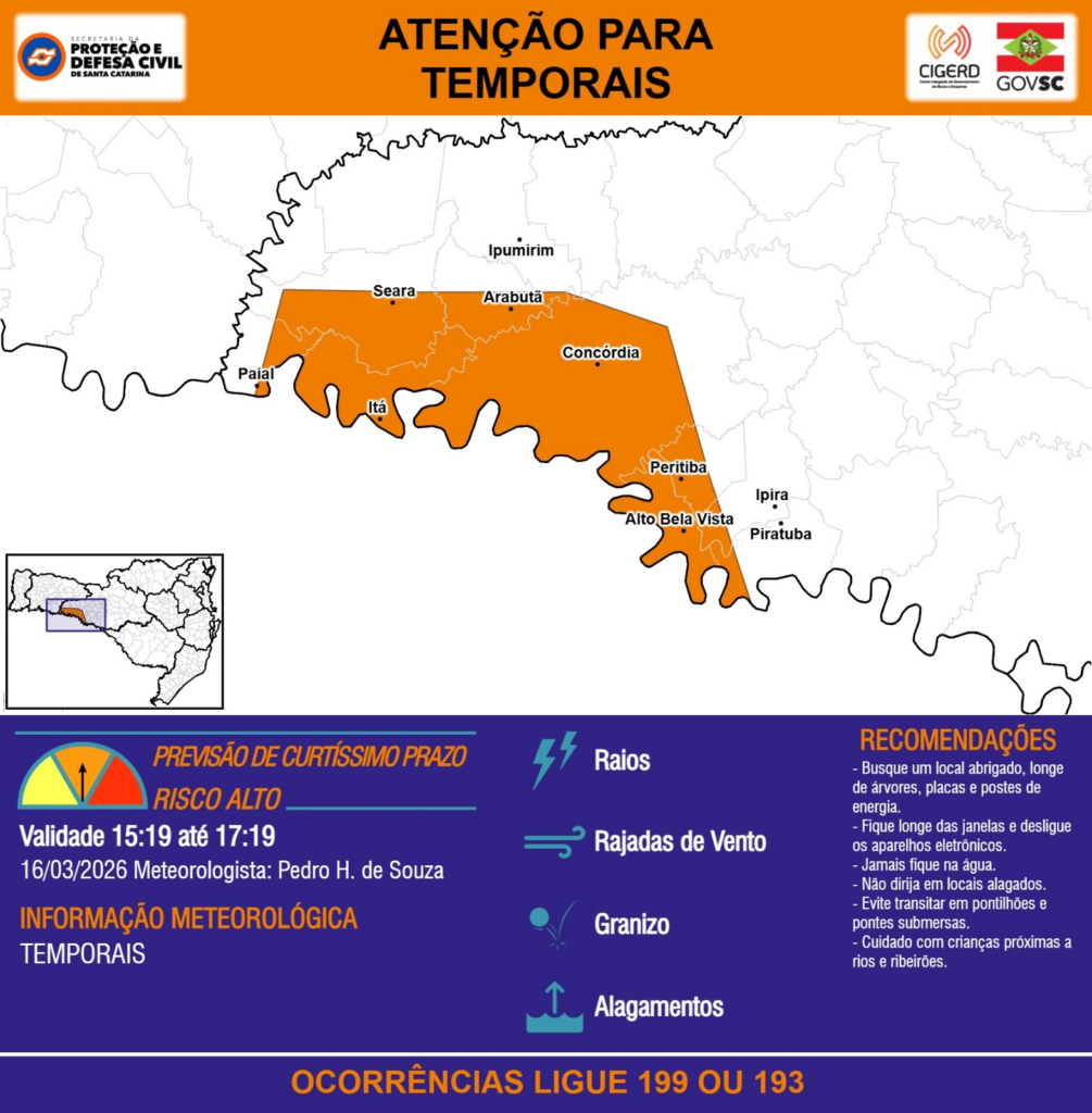 ATENÇÃO – 16/03 15:19 – TEMPORAIS com RAIOS, RAJADAS DE VENTO, GRANIZO e ALAGAMENTOS para áreas dos municípios de Alto Bela Vista, Arabutã, Concórdia, Ipira, Ipumirim, Itá, Paial, Peritiba, Piratuba e Seara nas próximas 2 horas. Ocorrências ligue 199 ou 193.