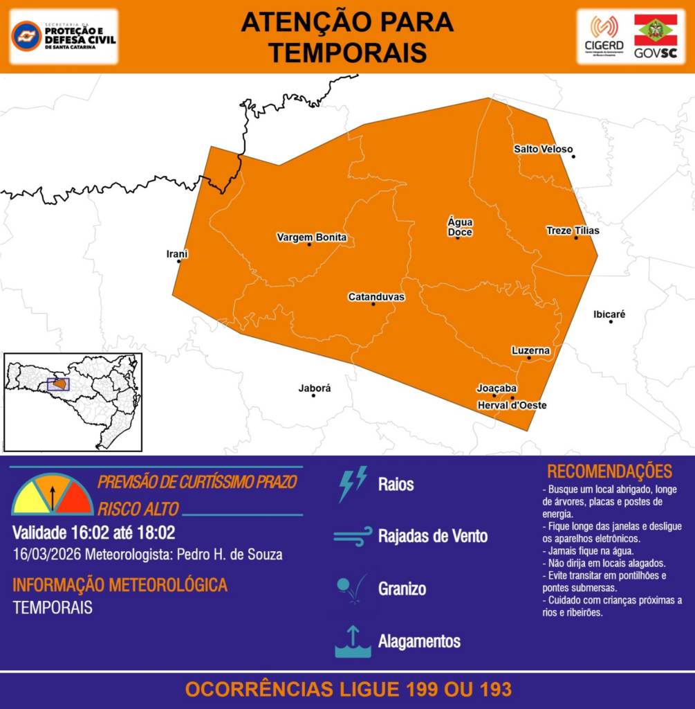 ATENÇÃO – 16/03 16:02 – TEMPORAIS com RAIOS, RAJADAS DE VENTO, GRANIZO e ALAGAMENTOS para áreas dos municípios de Catanduvas, Herval d’Oeste, Ibicaré, Irani, Jaborá, Joaçaba, Luzerna, Salto Veloso, Treze Tílias, Vargem Bonita e Água Doce nas próximas 2 horas. Ocorrências ligue 199 ou 193.