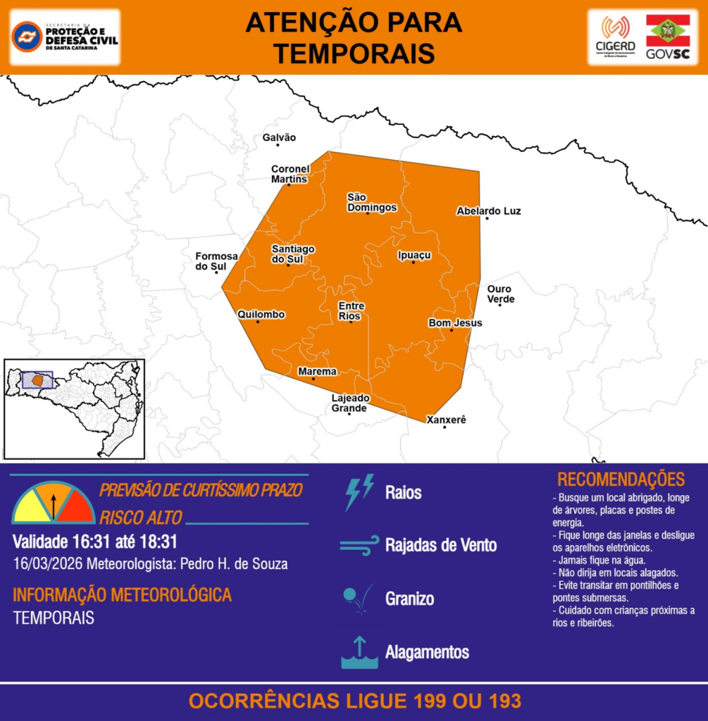 ATENÇÃO – 16/03 16:31 – TEMPORAIS com RAIOS, RAJADAS DE VENTO, GRANIZO e ALAGAMENTOS para áreas dos municípios de Abelardo Luz, Bom Jesus, Coronel Martins, Entre Rios, Formosa do Sul, Galvão, Ipuaçu, Lajeado Grande, Marema, Ouro Verde, Quilombo, Santiago do Sul, São Domingos, Xanxerê nas próximas 2 horas. Ocorrências ligue 199 ou 193.