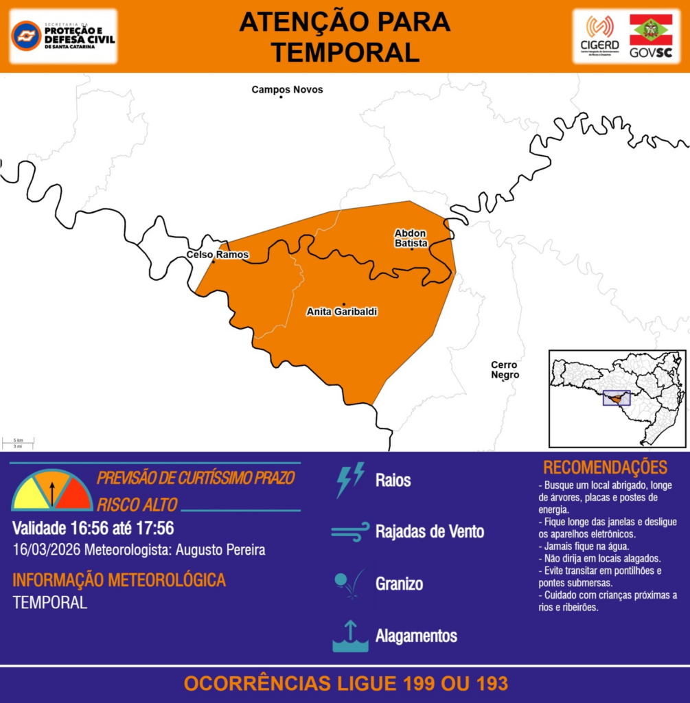 ATENÇÃO – 16/03 16:56 – TEMPORAL com RAIOS, RAJADAS DE VENTO, GRANIZO e ALAGAMENTOS para os municípios de Abdon Batista, Anita Garibaldi, Campos Novos, Celso Ramos e Cerro Negro na próxima hora. Ocorrências ligue 199 ou 193.