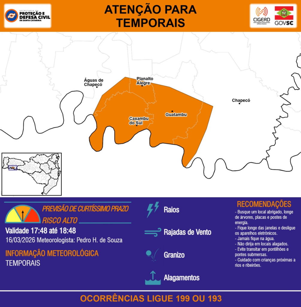ATENÇÃO – 16/03 17:48 – TEMPORAIS com RAIOS, RAJADAS DE VENTO, GRANIZO e ALAGAMENTOS para áreas dos municípios de Caxambu do Sul, Chapecó, Guatambu, Planalto Alegre e Águas de Chapecó na próxima hora. Ocorrências ligue 199 ou 193.