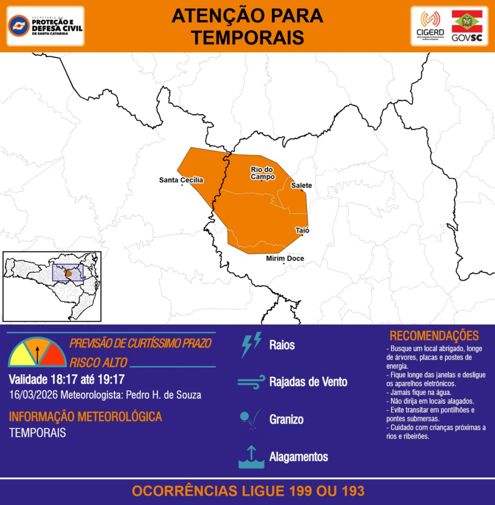 ATENÇÃO – 16/03 18:17 – TEMPORAIS com RAIOS, RAJADAS DE VENTO, GRANIZO e ALAGAMENTOS para áreas dos municípios de Mirim Doce, Rio do Campo, Salete, Santa Cecília e Taió na próxima hora. Ocorrências ligue 199 ou 193.