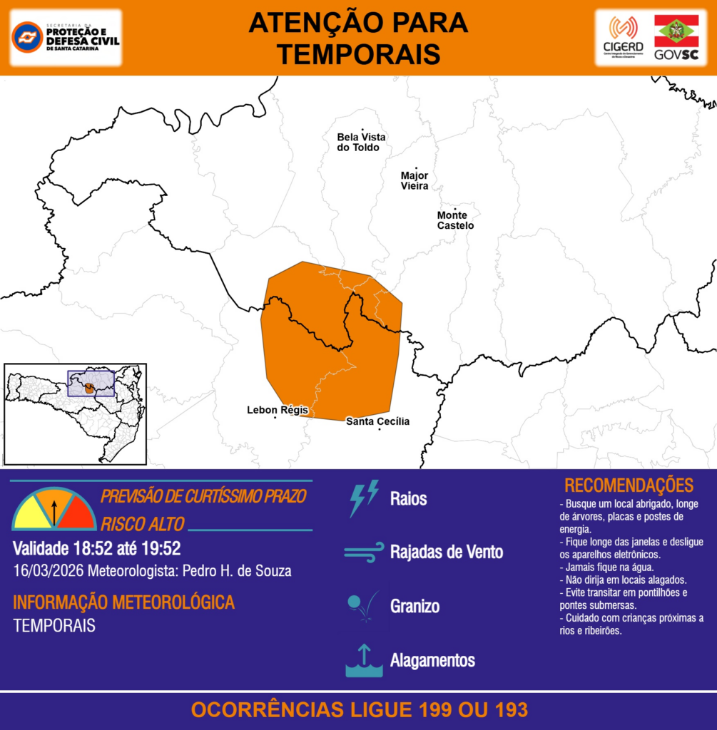 ATENÇÃO – 16/03 18:52 – TEMPORAIS com RAIOS, RAJADAS DE VENTO, GRANIZO e ALAGAMENTOS para áreas dos municípios de Bela Vista do Toldo, Lebon Régis, Major Vieira, Monte Castelo e Santa Cecília na próxima hora. Ocorrências ligue 199 ou 193.