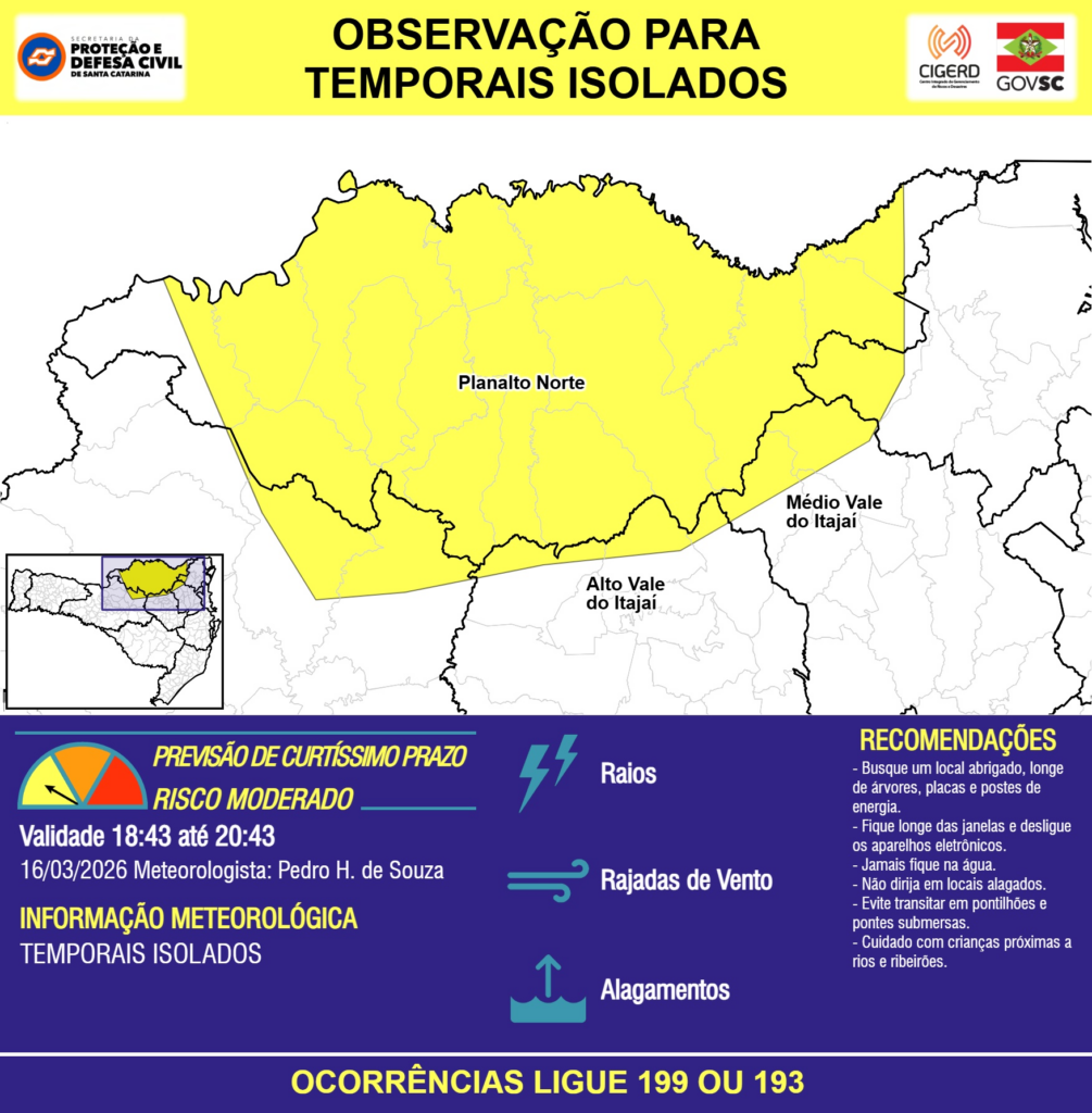 OBSERVAÇÃO – 16/03 18:43 – TEMPORAIS ISOLADOS com RAIOS, RAJADAS DE VENTO e ALAGAMENTOS pontuais para áreas das regiões do Meio-Oeste, Planalto Norte, Médio e Alto Vale do Itajaí nas próximas 2 horas. Ocorrências ligue 199 ou 193.