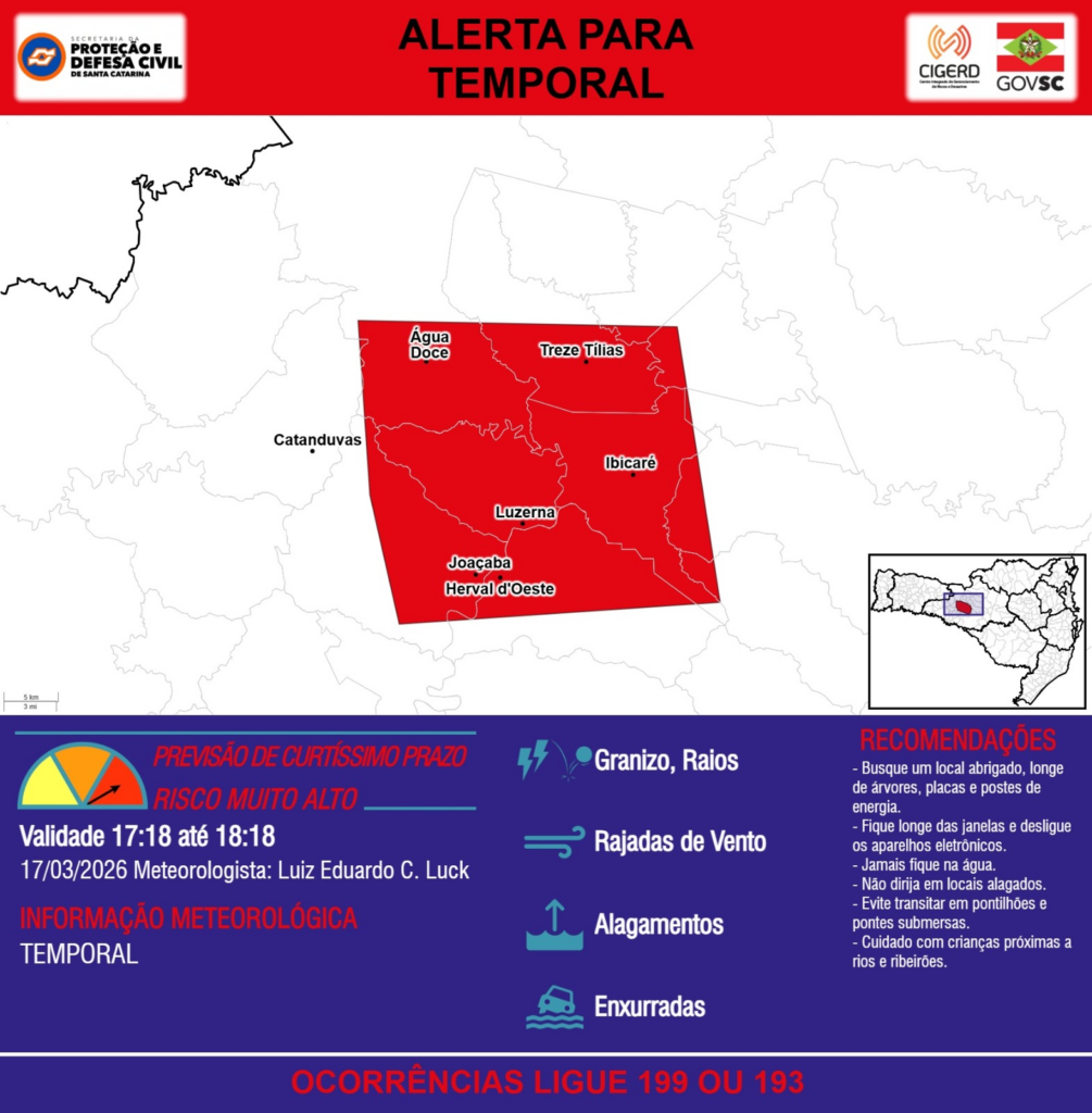 ALERTA – 17/03 17:18 – TEMPORAL com RAJADAS DE VENTO, ALAGAMENTOS, GRANIZO, RAIOS e risco de ENXURRADAS para os municípios de Campos Novos, Catanduvas, Herval d’Oeste, Ibicaré, Joaçaba, Luzerna, Treze Tílias e Água Doce na próxima hora. Ocorrências ligue 199 ou 193.