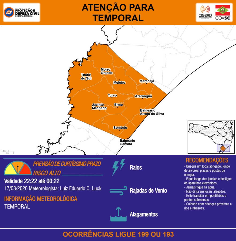 ATENÇÃO – 17/03 22:22 – TEMPORAL com RAIOS, RAJADAS DE VENTO e ALAGAMENTOS para os municípios de Araranguá, Balneário Arroio do Silva, Balneário Gaivota, Ermo, Jacinto Machado, Maracajá, Meleiro, Morro Grande, Sombrio, Timbé do Sul e Turvo nas próximas 2 horas. Ocorrências ligue 199 ou 193.