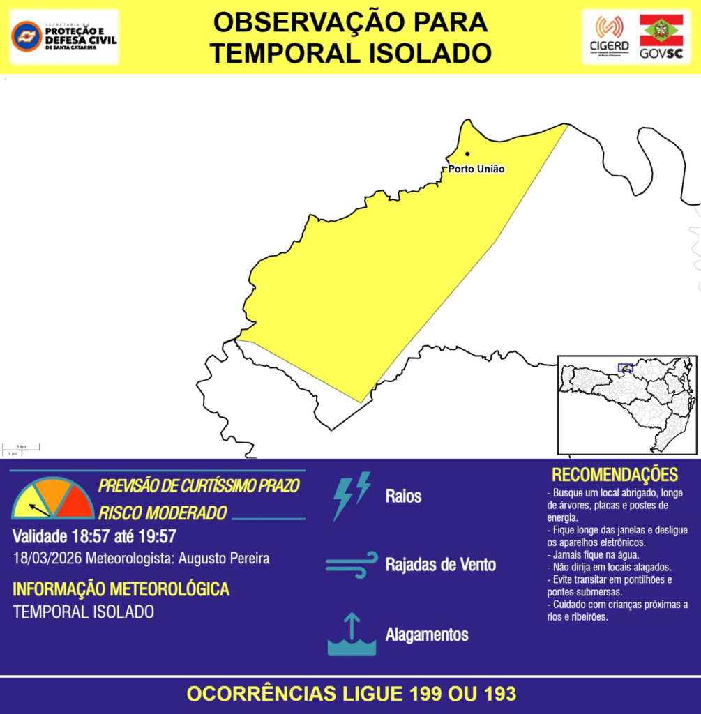 OBSERVAÇÃO – 18/03 18:57 – TEMPORAL ISOLADO com RAIOS, RAJADAS DE VENTO e ALAGAMENTOS pontuais para o município de Porto União na próxima hora. Ocorrências ligue 199 ou 193.
