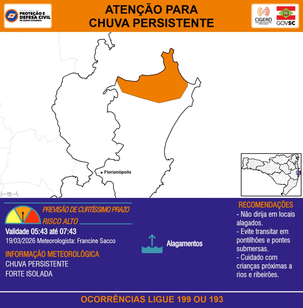 ATENÇÃO – 19/03 05:43 – CHUVA PERSISTENTE de intensidade forte isolada com ALAGAMENTOS para o município de Florianópolis nas próximas 2 horas. Ocorrências ligue 199 ou 193.