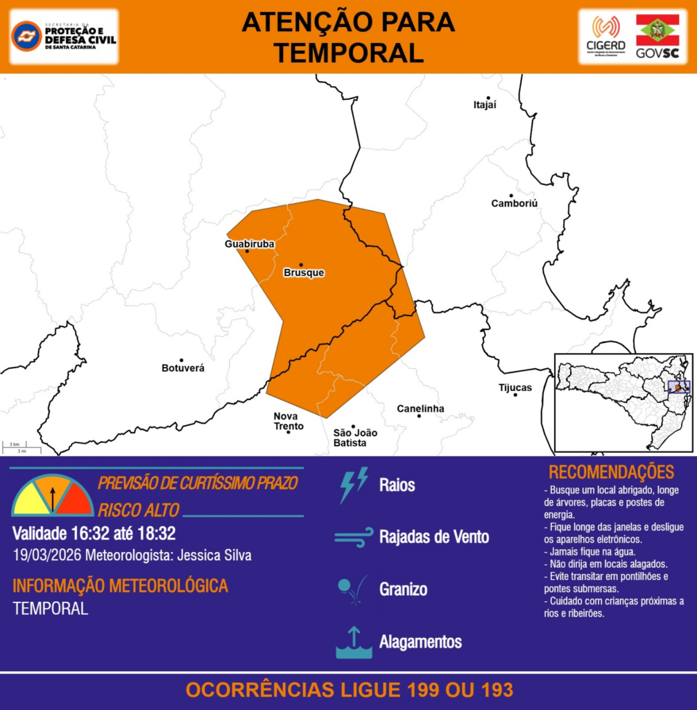ATENÇÃO – 19/03 16:32 – TEMPORAL com RAIOS, RAJADAS DE VENTO, GRANIZO e ALAGAMENTOS para os municípios de Botuverá, Brusque, Camboriú, Canelinha, Guabiruba, Itajaí, Nova Trento, São João Batista e Tijucas nas próximas 2 horas. Ocorrências ligue 199 ou 193.