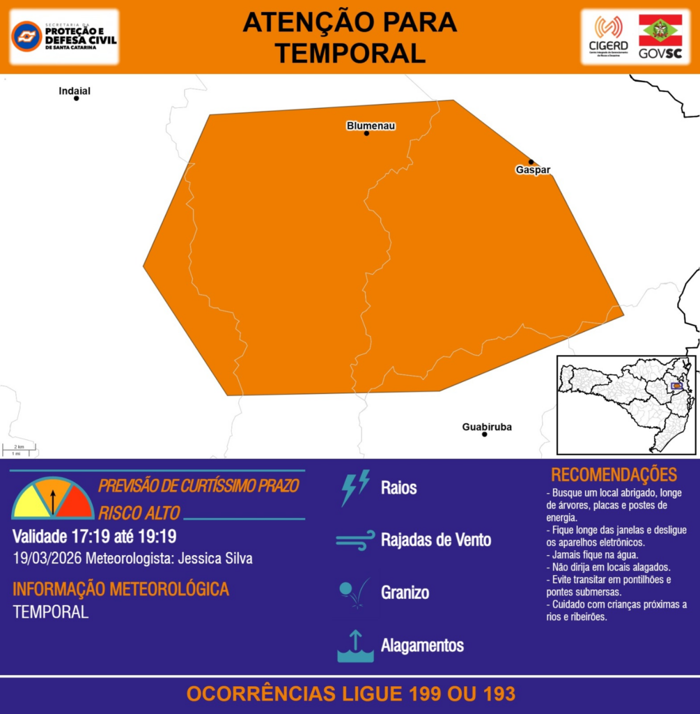 ATENÇÃO – 19/03 17:19 – TEMPORAL com RAIOS, RAJADAS DE VENTO, GRANIZO e ALAGAMENTOS para os municípios de Blumenau, Brusque, Gaspar, Guabiruba e Indaial nas próximas 2 horas. Ocorrências ligue 199 ou 193.