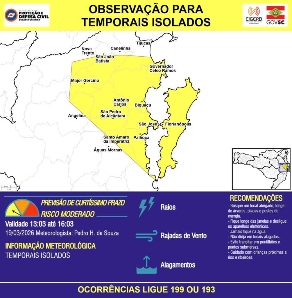 OBSERVAÇÃO – 19/03 13:03 – TEMPORAIS ISOLADOS com RAIOS, RAJADAS DE VENTO e ALAGAMENTOS pontuais para os municípios de Angelina, Antônio Carlos, Biguaçu, Canelinha, Florianópolis, Governador Celso Ramos, Major Gercino, Nova Trento, Palhoça, Santo Amaro da Imperatriz, São José, São João Batista, São Pedro de Alcântara, Tijucas e Águas Mornas nas próximas 3 horas. Ocorrências ligue 199 ou 193.