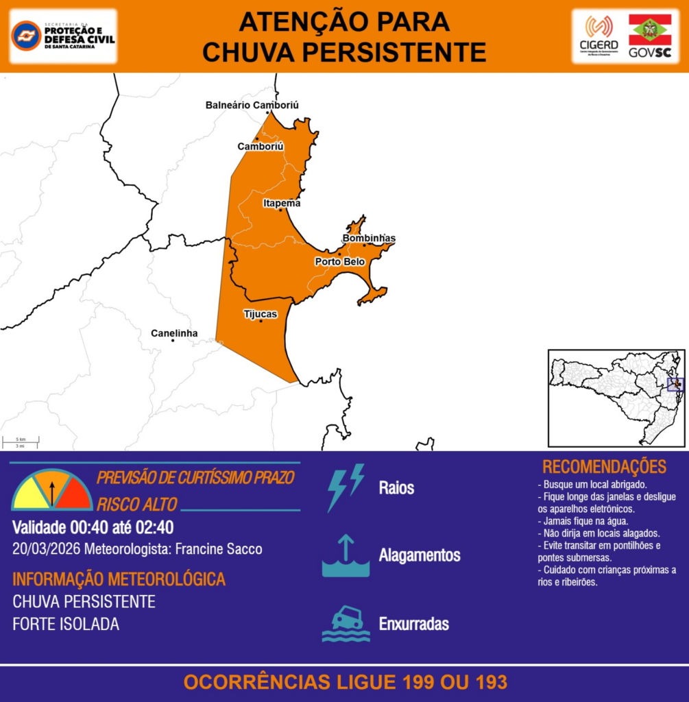 ATENÇÃO – 20/03 00:40 – CHUVA PERSISTENTE de intensidade forte isolada com RAIOS, ALAGAMENTOS e risco de ENXURRADAS para as regiões da Grande Florianópolis e Baixo Vale do Itajaí nas próximas 2 horas. Ocorrências ligue 199 ou 193.