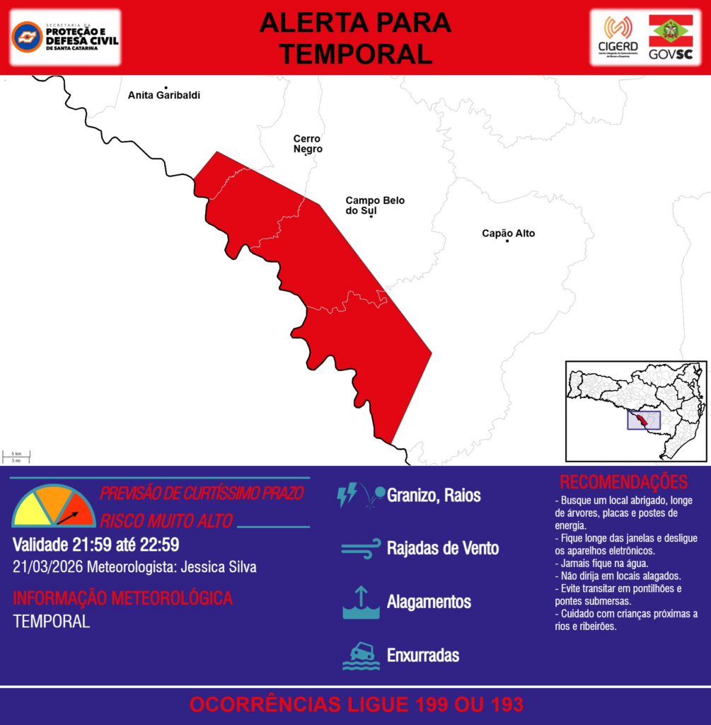 ALERTA – 21/03 21:59 – TEMPORAL com RAJADAS DE VENTO, ALAGAMENTOS, GRANIZO, RAIOS e risco de ENXURRADAS para os municípios de Anita Garibaldi, Campo Belo do Sul, Capão Alto e Cerro Negro na próxima hora. Ocorrências ligue 199 ou 193.