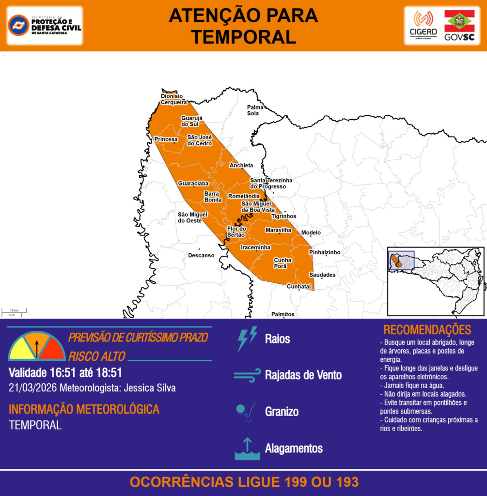 ATENÇÃO – 21/03 16:51 – TEMPORAL com RAIOS, RAJADAS DE VENTO, GRANIZO e ALAGAMENTOS para os municípios de Anchieta, Barra Bonita, Caibi, Cunha Porã, Cunhataí, Descanso, Dionísio Cerqueira, Flor do Sertão, Guaraciaba, Guarujá do Sul, Iraceminha, Maravilha, Modelo, Palma Sola, Palmitos, Pinhalzinho, Princesa, Romelândia, Santa Terezinha do Progresso, Saudades, São José do Cedro, São Miguel da Boa Vista, São Miguel do Oeste e Tigrinhos nas próximas 2 horas. Ocorrências ligue 199 ou 193.