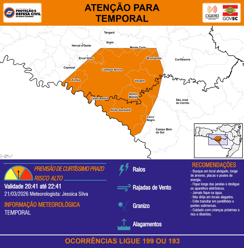 ATENÇÃO – 21/03 20:41 – TEMPORAL com RAIOS, RAJADAS DE VENTO, GRANIZO e ALAGAMENTOS para os municípios de Abdon Batista, Anita Garibaldi, Brunópolis, Campo Belo do Sul, Campos Novos, Capinzal, Celso Ramos, Cerro Negro, Curitibanos, Erval Velho, Herval d’Oeste, Ibiam, Monte Carlo, São José do Cerrito, Tangará, Vargem e Zortéa nas próximas 2 horas. Ocorrências ligue 199 ou 193.