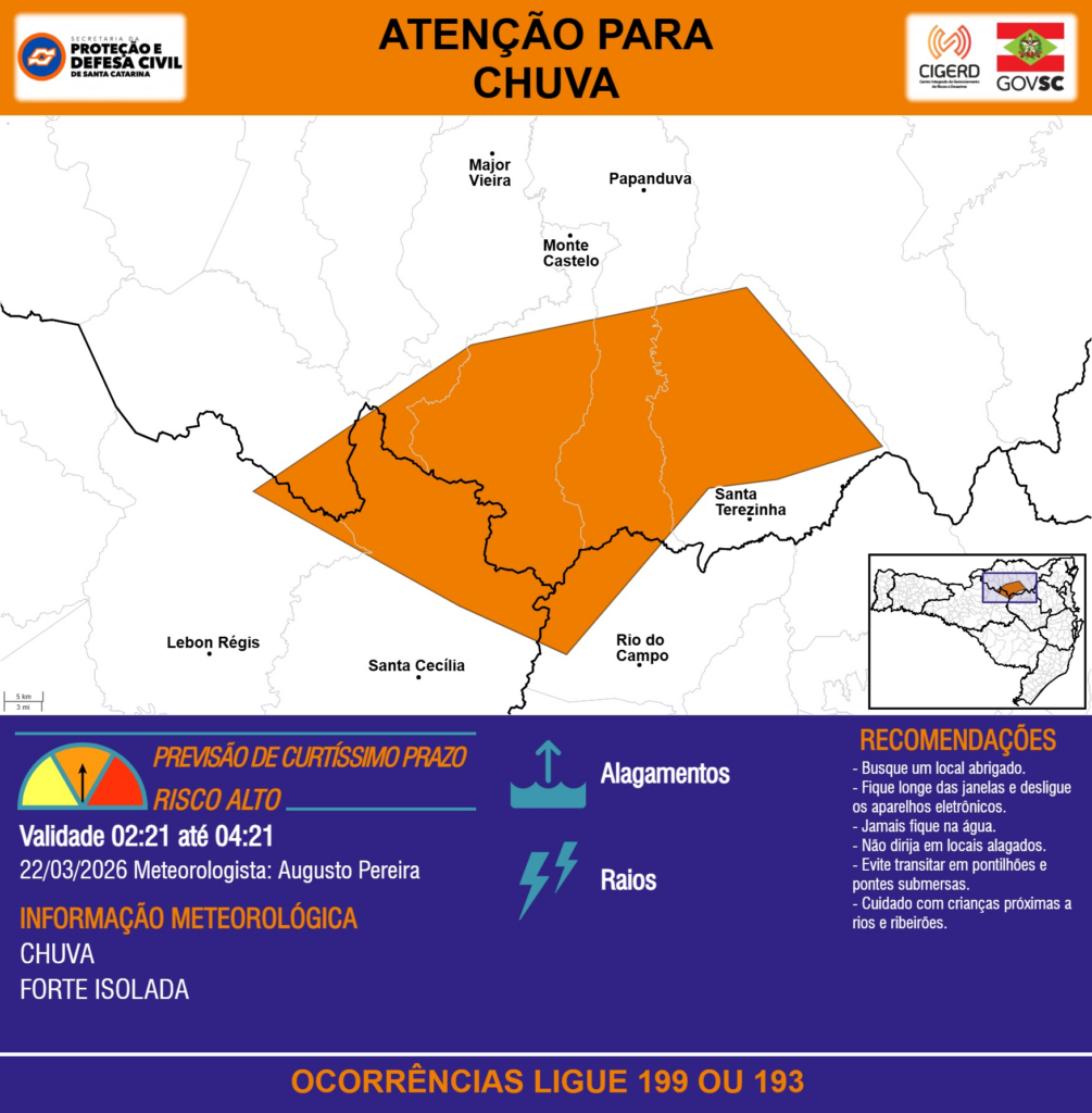 ATENÇÃO – 22/03 02:21 – CHUVA de intensidade forte isolada com ALAGAMENTOS e RAIOS para as regiões do Meio-Oeste, Planalto Norte e Alto Vale do Itajaí nas próximas 2 horas. Ocorrências ligue 199 ou 193.