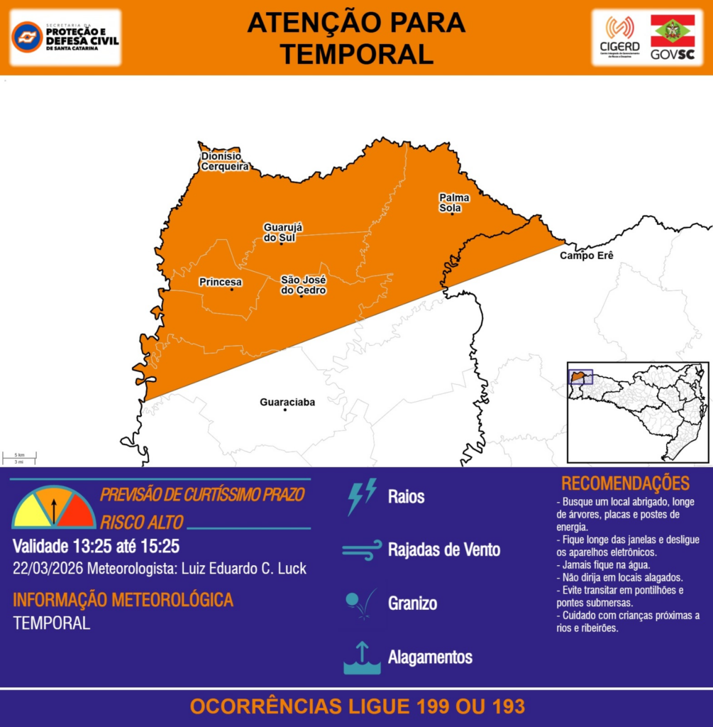 ATENÇÃO – 22/03 13:25 – TEMPORAL com RAIOS, RAJADAS DE VENTO, GRANIZO e ALAGAMENTOS para os municípios de Campo Erê, Dionísio Cerqueira, Guaraciaba, Guarujá do Sul, Palma Sola, Princesa e São José do Cedro nas próximas 2 horas. Ocorrências ligue 199 ou 193.