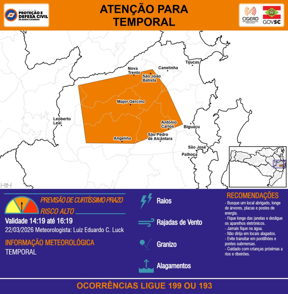 ATENÇÃO – 22/03 14:19 – TEMPORAL com RAIOS, RAJADAS DE VENTO, GRANIZO e ALAGAMENTOS para os municípios de Angelina, Antônio Carlos, Biguaçu, Canelinha, Leoberto Leal, Major Gercino, Nova Trento, Palhoça, São José, São João Batista, São Pedro de Alcântara e Tijucas nas próximas 2 horas. Ocorrências ligue 199 ou 193.