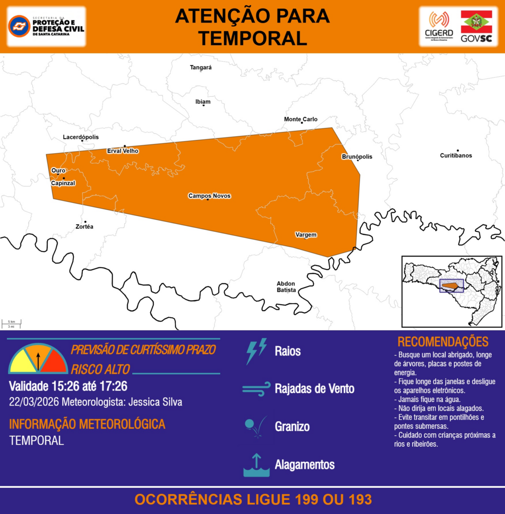 ATENÇÃO – 22/03 15:26 – TEMPORAL com RAIOS, RAJADAS DE VENTO, GRANIZO e ALAGAMENTOS para os municípios de Abdon Batista, Brunópolis, Campos Novos, Capinzal, Curitibanos, Erval Velho, Ibiam, Lacerdópolis, Monte Carlo, Ouro, São José do Cerrito, Tangará, Vargem e Zortéa nas próximas 2 horas. Ocorrências ligue 199 ou 193.