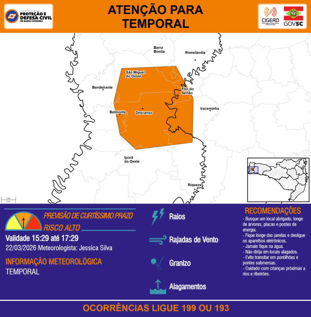 ATENÇÃO – 22/03 15:29 – TEMPORAL com RAIOS, RAJADAS DE VENTO, GRANIZO e ALAGAMENTOS para os municípios de Bandeirante, Barra Bonita, Belmonte, Descanso, Flor do Sertão, Iporã do Oeste, Iraceminha, Riqueza, Romelândia e São Miguel do Oeste nas próximas 2 horas. Ocorrências ligue 199 ou 193.
