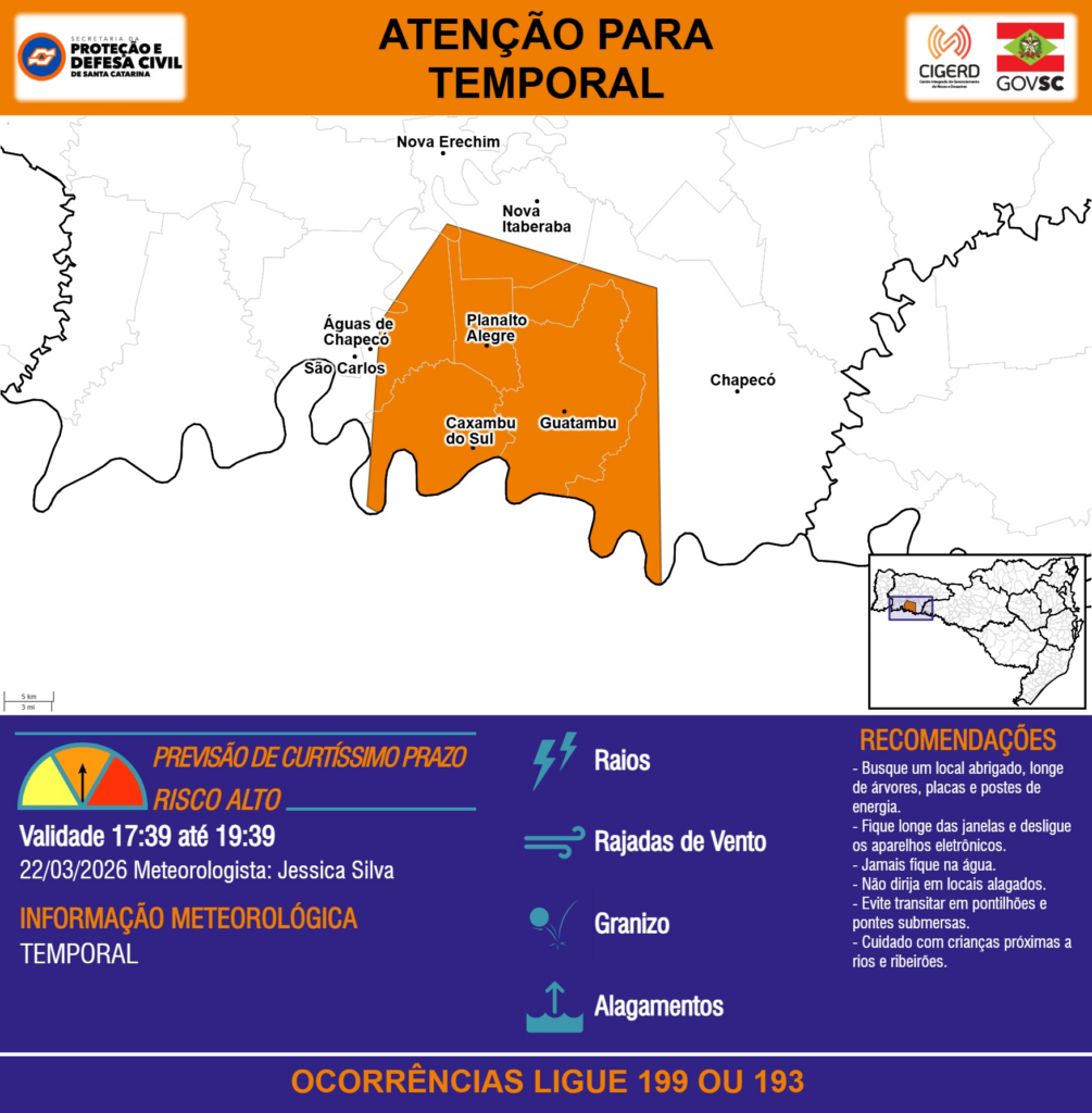 ATENÇÃO – 22/03 17:39 – TEMPORAL com RAIOS, RAJADAS DE VENTO, GRANIZO e ALAGAMENTOS para os municípios de Caxambu do Sul, Chapecó, Guatambu, Nova Erechim, Nova Itaberaba, Planalto Alegre, São Carlos e Águas de Chapecó nas próximas 2 horas. Ocorrências ligue 199 ou 193.