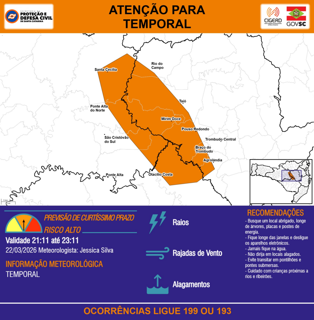 ATENÇÃO – 22/03 21:11 – TEMPORAL com RAIOS, RAJADAS DE VENTO e ALAGAMENTOS para os municípios de Agrolândia, Braço do Trombudo, Mirim Doce, Otacílio Costa, Ponte Alta, Ponte Alta do Norte, Pouso Redondo, Rio do Campo, Santa Cecília, São Cristóvão do Sul, Taió e Trombudo Central nas próximas 2 horas. Ocorrências ligue 199 ou 193.
