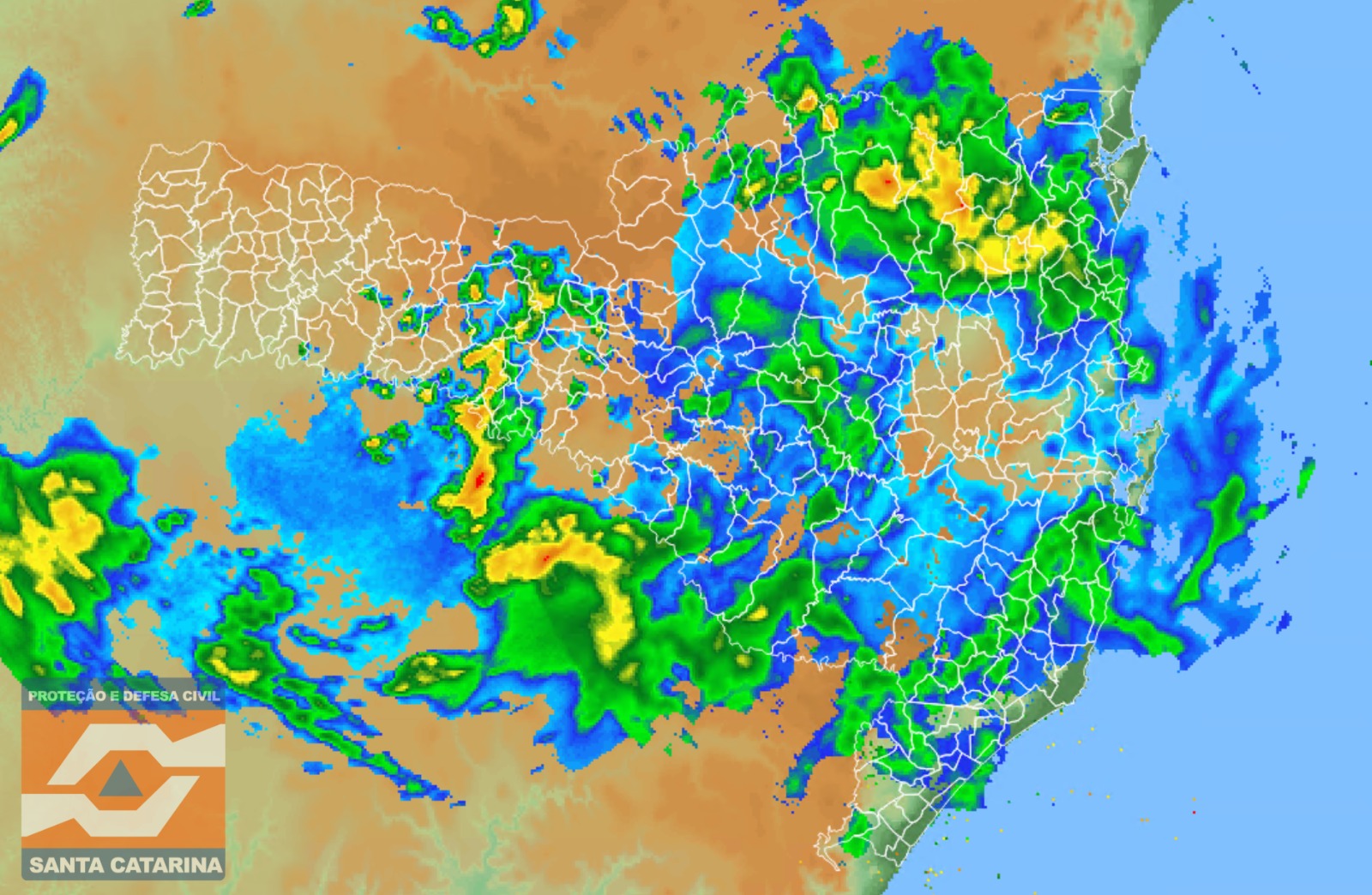 Este domingo (22) iniciou com alguns temporais e chuva de intensidade moderada, principalmente entre as regiões dos Planaltos, registrando-se nesta madrugada os maiores acumulados de precipitação em Pouso Redondo (41 mm), Correia Pinto (39 mm) e Salete (38 mm). Essa instabilidade é por conta da passagem de uma frente fria, e na imagem de radar é possível verificar a chuva atuando entre o Meio-Oeste, Planalto Norte e Vale do Itajaí. Algumas instabilidades entram progressivamente a partir do RS. No momento, o risco é baixo a pontualmente moderado para ocorrências. As condições de tempo instável devem persistir nas próximas horas por conta da atuação do sistema frontal. As temperaturas variam entre 22°C e 25°C na maior parte de Santa Catarina, com exceção das regiões de serra, que variam entre 15°C e 18°C.