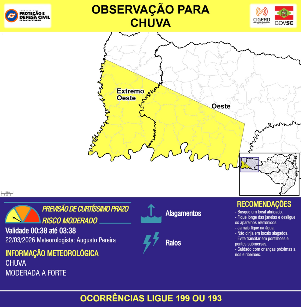 OBSERVAÇÃO – 22/03 00:38 – CHUVA de intensidade moderada a forte com RAIOS e ALAGAMENTOS pontuais para as regiões do Extremo Oeste e Oeste nas próximas 3 horas. Ocorrências ligue 199 ou 193.