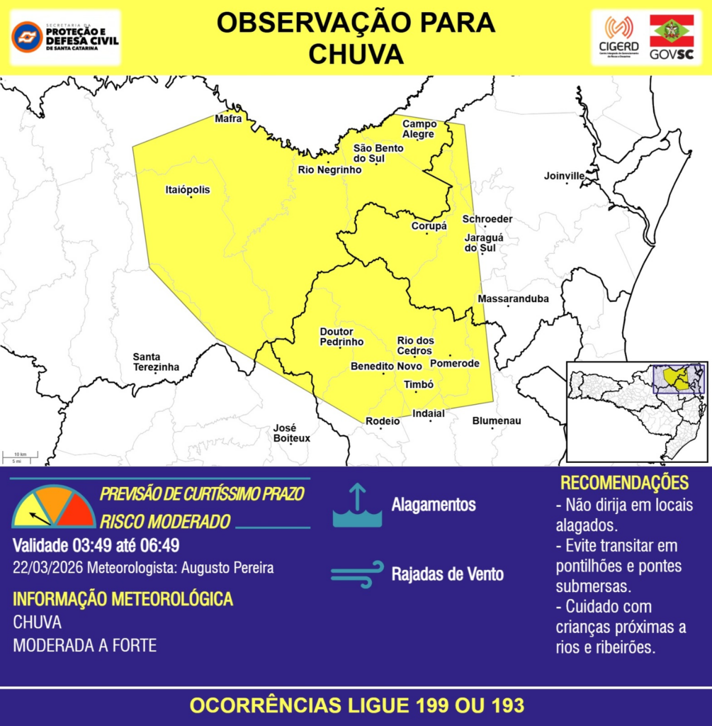 OBSERVAÇÃO – 22/03 03:49 – CHUVA de intensidade moderada a forte com RAJADAS DE VENTO e ALAGAMENTOS pontuais para as regiões do Planalto Norte, Litoral Norte, Médio e Alto Vale do Itajaí nas próximas 3 horas. Ocorrências ligue 199 ou 193.
