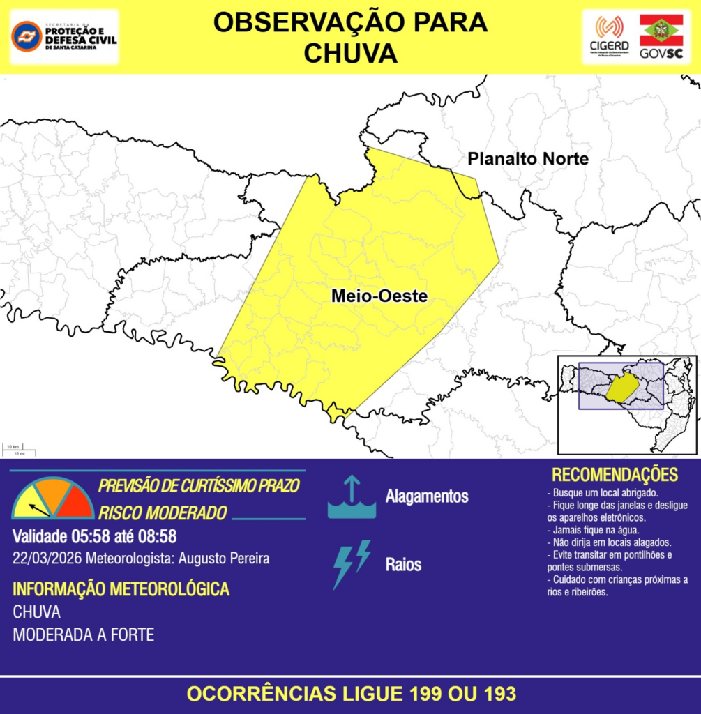 OBSERVAÇÃO – 22/03 05:58 – CHUVA de intensidade moderada a forte com RAIOS e ALAGAMENTOS pontuais para as regiões do Meio-Oeste, Planalto Norte e Planalto Sul nas próximas 3 horas. Ocorrências ligue 199 ou 193.