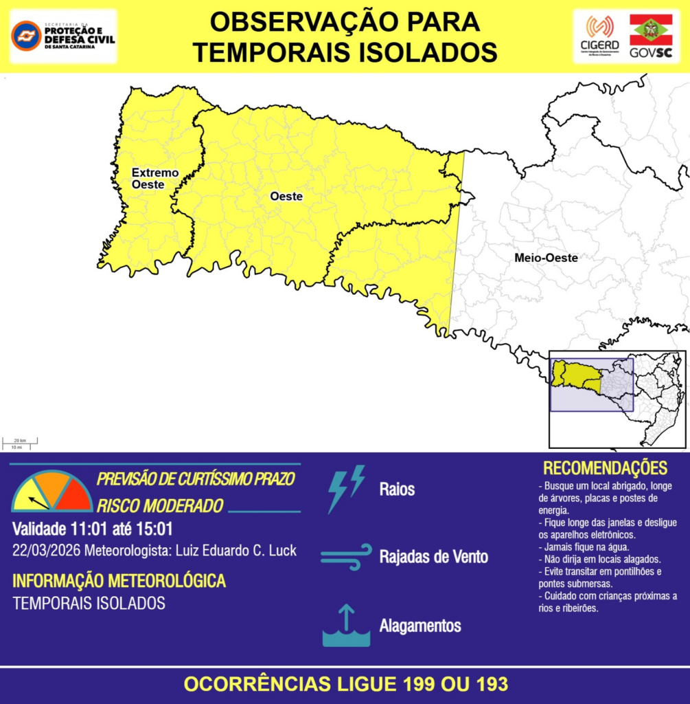 OBSERVAÇÃO – 22/03 11:01 – TEMPORAIS ISOLADOS com RAIOS, RAJADAS DE VENTO e ALAGAMENTOS pontuais para as regiões do Extremo Oeste, Oeste e Meio-Oeste nas próximas 4 horas. Ocorrências ligue 199 ou 193.