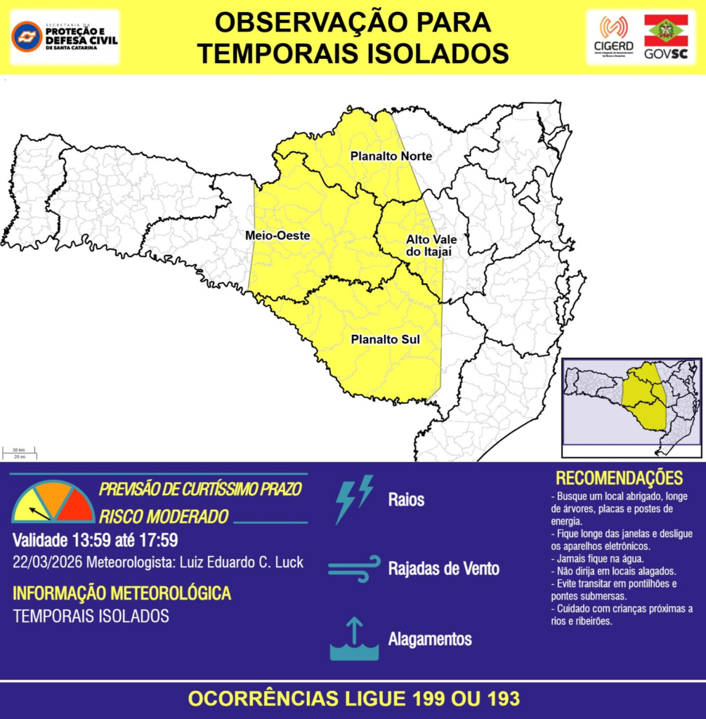 OBSERVAÇÃO – 22/03 13:59 – TEMPORAIS ISOLADOS com RAIOS, RAJADAS DE VENTO e ALAGAMENTOS pontuais para as regiões do Meio-Oeste, Planalto Norte, Planalto Sul e Alto Vale do Itajaí nas próximas 4 horas. Ocorrências ligue 199 ou 193.